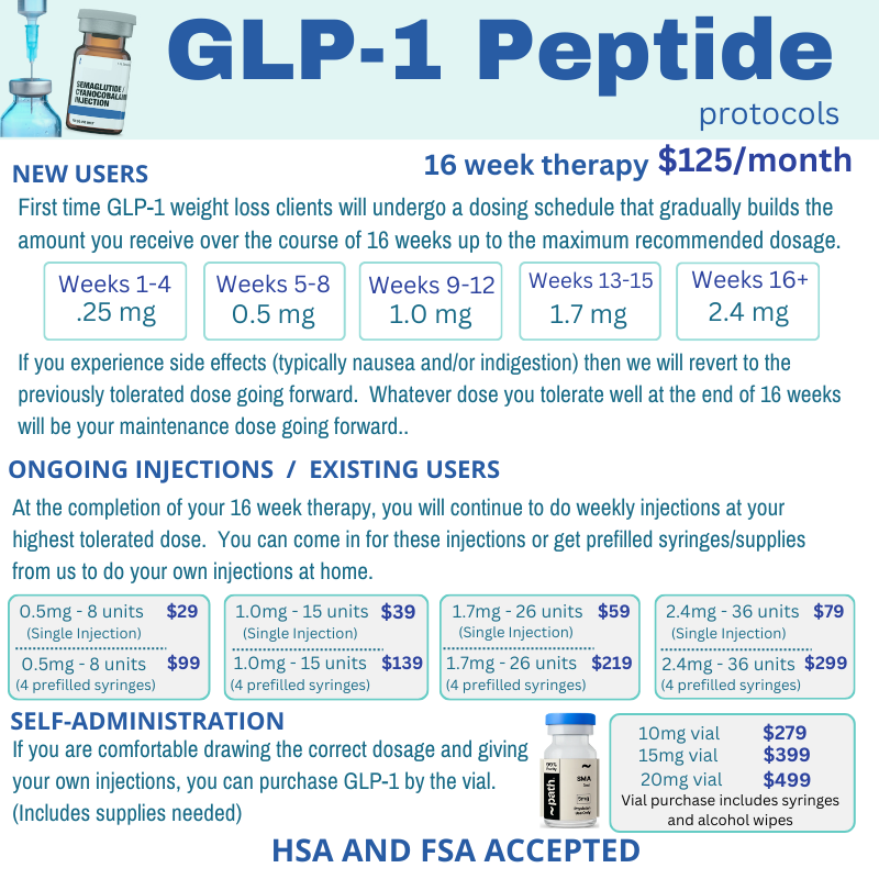 Clients new to GLP-1 injections will need to complete some intake forms prior to beginning their first injection. A Medical review will be completed within 1-2 business days and you will be notified of your eligibility. You may also complete these forms online if you prefer by CLICKING HERE